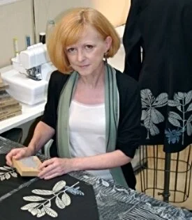 My training and specialties are in textile and apparel design, illustration, and costume history. My botanical and insect inspired collection is linoleum block printed. I design, illustrate and painstakingly hand-carve each linoleum block. Each garment section is printed before construction. I layer prints and colors to get the desired effect, carefully considering all the garment design details before printing. I translate shapes and details from the past, adding a contemporary twist. I strive to create a unique, wearable, and beautifully constructed garment with timeless design, historical references, and impeccable craftsmanship.